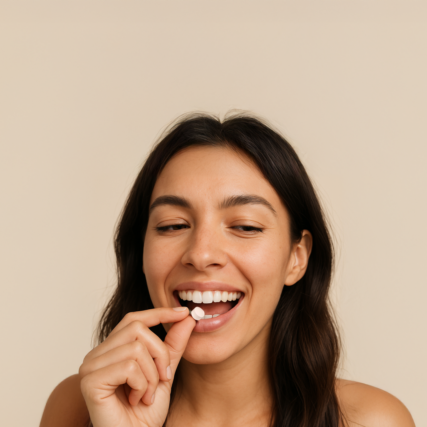 Pop a tablet in your mouth and bite down, or just place it onto your wet toothbrush bristles. The tablet will break up and activate like magic ✨ Brush like you mean it. Spit. Rinse. Flash that smile. Do it twice a day to keep your teeth bright and your dentist impressed. 😎