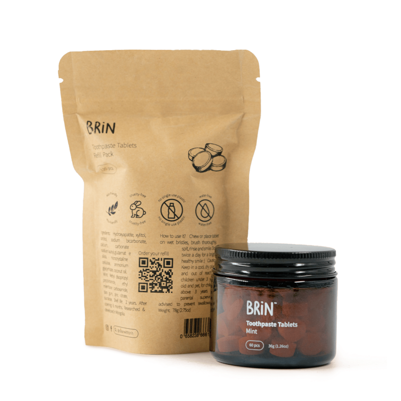 Time to top up. Designed to top up your OG BRiN glass jar, our Slow-Living Toothpaste Tablet Refills in fresh mint are perfect for brushing sustainably -without the waste.