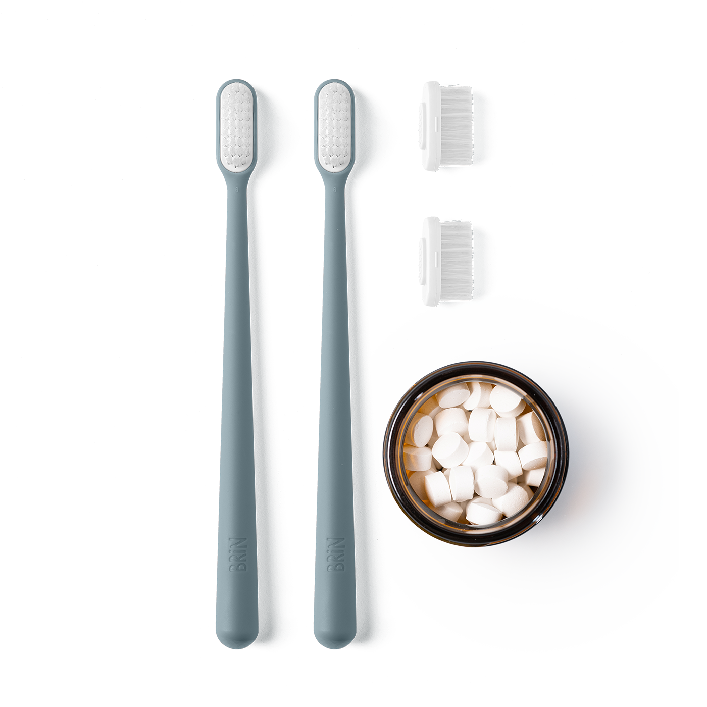 Good things come in pairs, like you and your brushing BFF. The BRiN Duo Care Kit hooks you up with 2 SeaDifferently toothbrushes, a shared jar of ultra-fresh toothpaste tablets, and 2 free brush head refills (because we love a bonus).